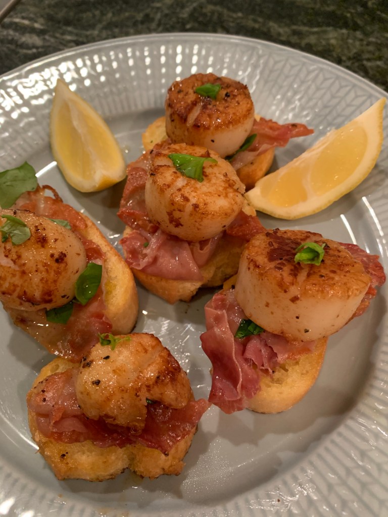 Stek baguettskivor i olja och smör/margarin. Snabbstek lite parmaskinka och lägg på brödskivorna. Pilgrimsmusslorna steks på hög värme ett par minuter bara så att de fortfarande är spänstiga när man lägger dem på brödet. Riv lite basilika på och ha på lite citronsaft. Mycket gott som förrätt.