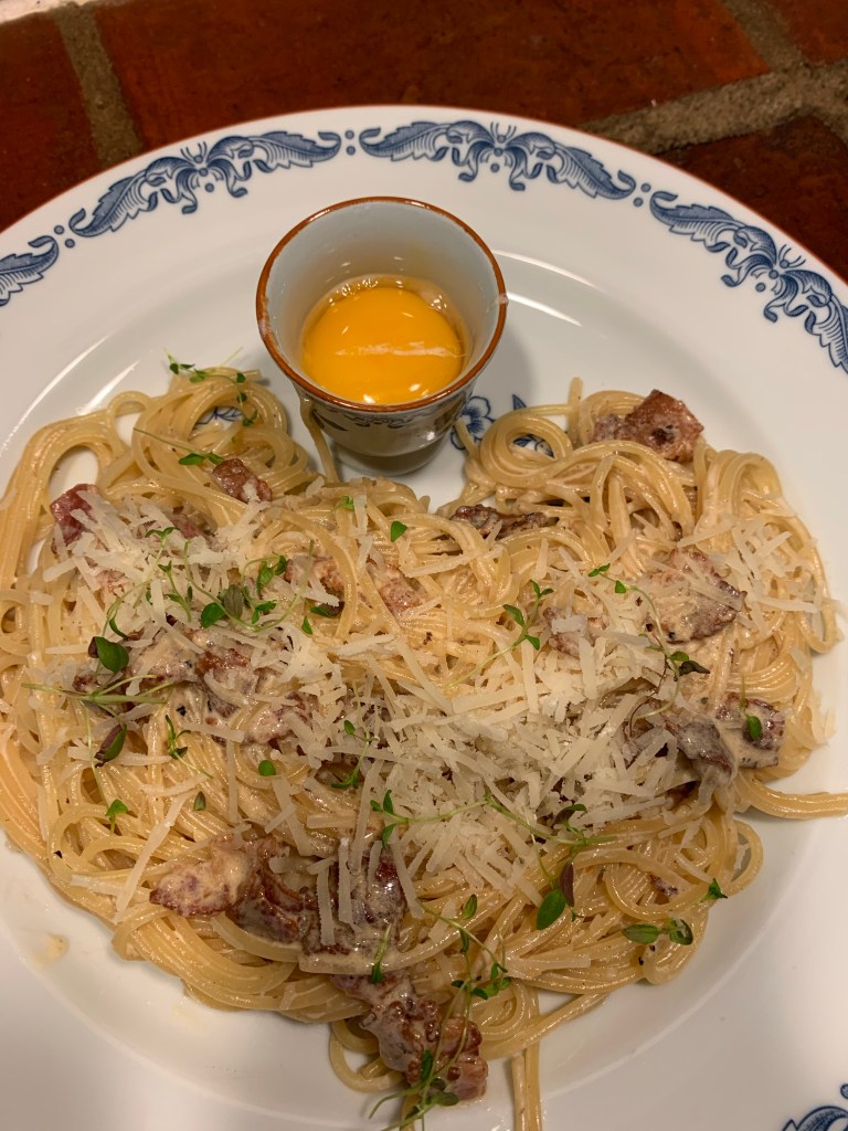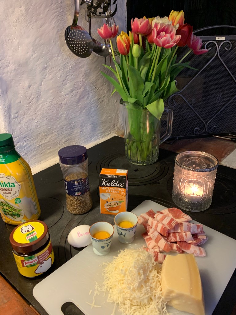 Alla ingredienser ser ni i bilden. Jag brukar ta en tsk buljongpulver i vattnet till spagettin och 1 tsk i såsen. Bacon, 1 rått ägg och en näve parmesan och lite svartpeppar. Ytterligare en äggula vid servering och mer parmesan och om man vill lite bladpersilja, timjan eller oregano. Rör ner den spagettin i den färdiga pastan i såsen. Om den dunstat för mycket ha i 0,5 dl mjölk. Koka spagettin så att den nästan är klar. Sista minuten på koktiden görs i såspannan. Smaklig måltid.