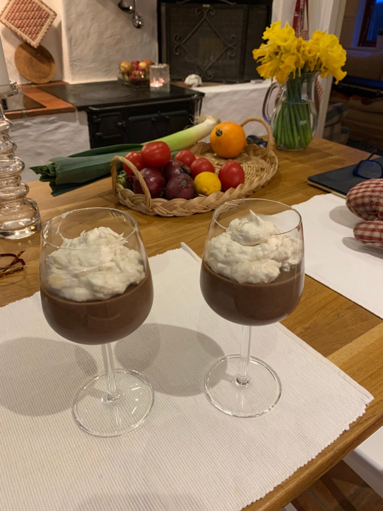 Jag gjorde Ekströms chokladpudding och mosade 2 bananer som jag blandade ner i 1 1/2 dl vispade grÀdde med en tsk socker.