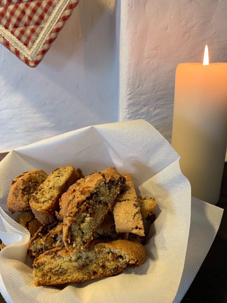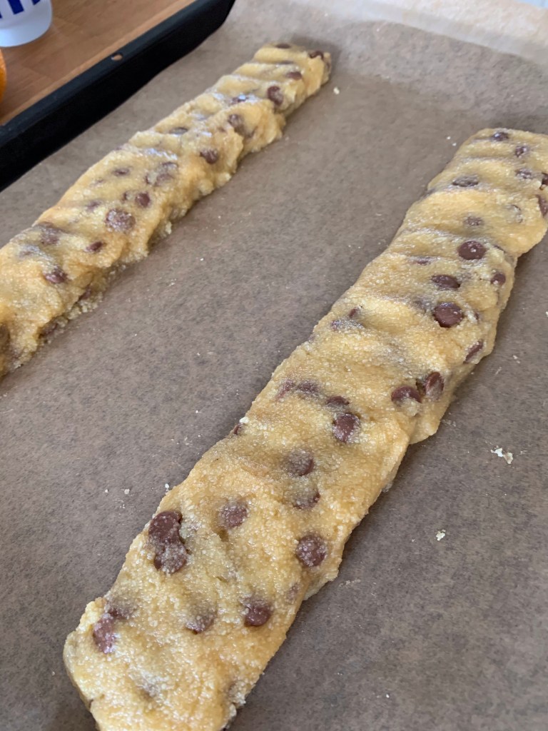 Biscotti är en Italiensk sorts skorpa och ska vara knaprig utan att vara stenhård. Man kan också byta ut chokladen mot hackad sötmandel (ca 1 dl). Mandelbiscotti är den vanligaste Italienska Biscottin.