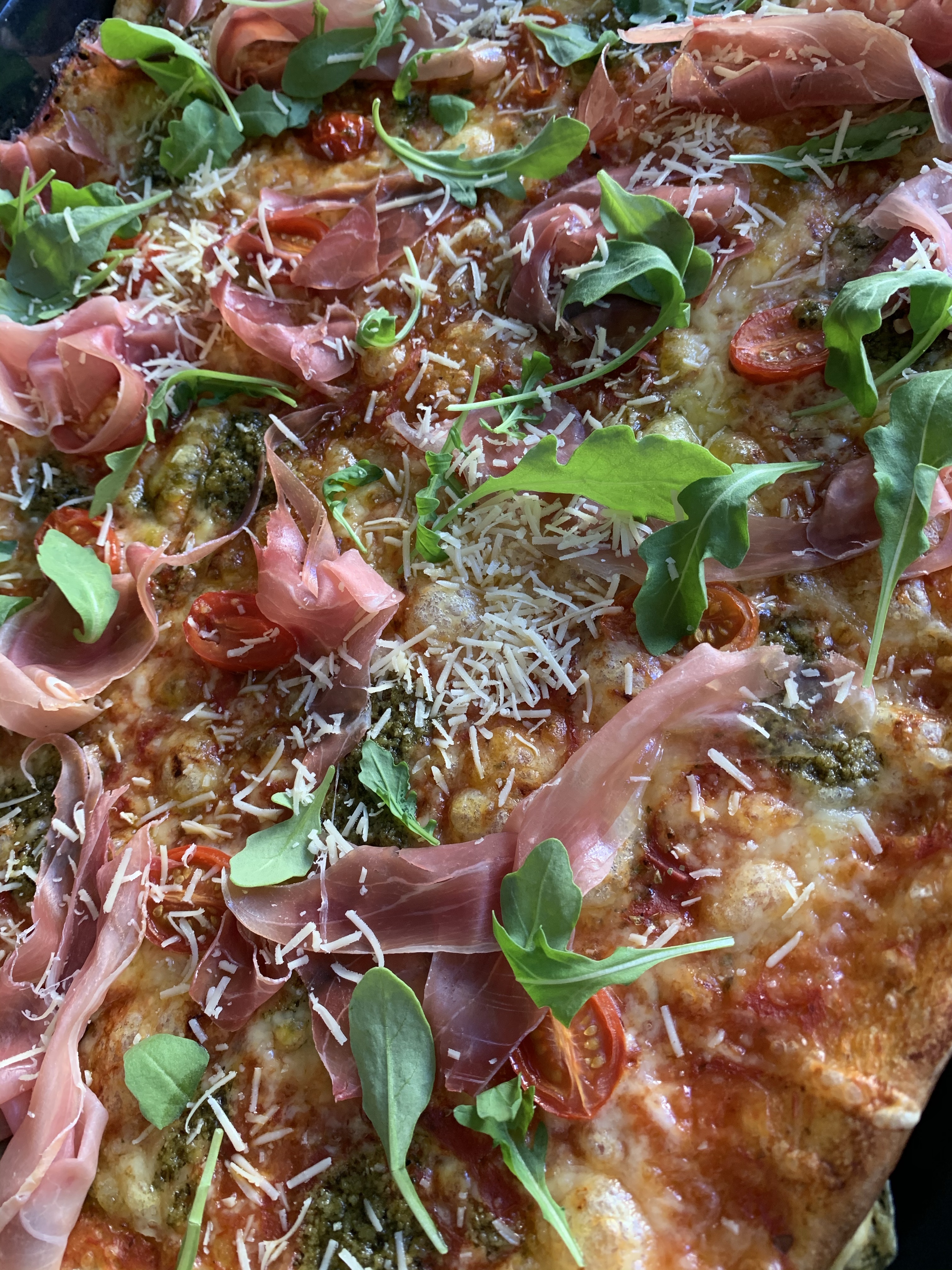 Ibland ska det vara extra enkelt. Pizzakit från Hemköp med tomatsås riven ost pesto och parmaskinka med ruccolasallad och lite riven parmesan på den färdiga pizzan.