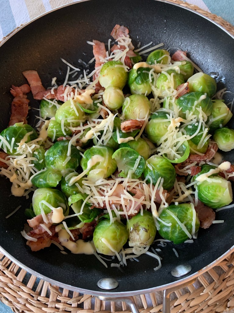 Förkoka färsk brysselkål så att de mjuknar men fortfarande är spänstiga tipps när de börjar tappa sin klara färg så har man kokat lite länge. Stek bacon vid sidan om och ha sedan i brysselkålen och strö över osten och vänd et par gånger inte mer. Klart att servera som sidorätt. Passar bra med kyckling, kalkon eller griskött.