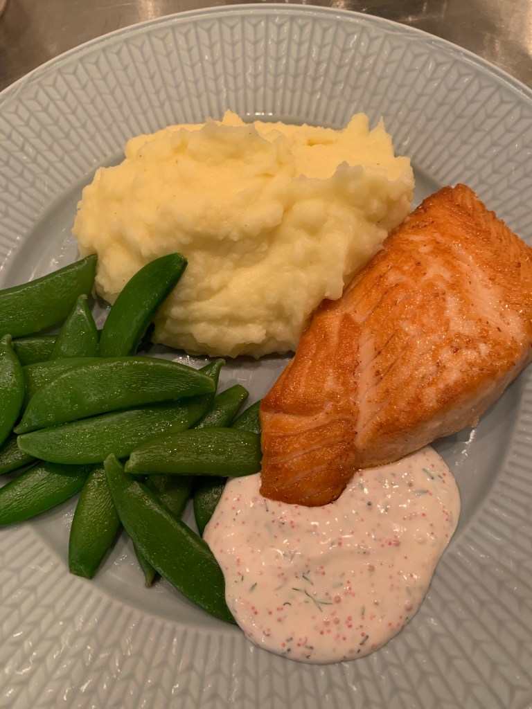 Börja steka laxen på hög värme för att få en härlig stekyta sänk sedan värme och stek klart på låg värme.