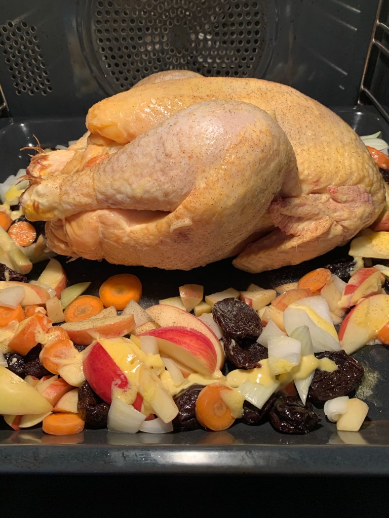 5 äpplen, 2 gullök, en påse sviskon, ett knippe bladpersilja, portvin ca 2 dl totalt, hönsbuljong 2 tärningar, salt, vitpeppar och flytande margarin på, i och runt kalkonen. Kleta in kalkonen i smöret (engångshandskar är perfekta för detta). Häll lite vatten i pannan också ca 2 dl och ytterligare ca 1 dl vatten när man tar ut kalkonen för att snitta loss benen.