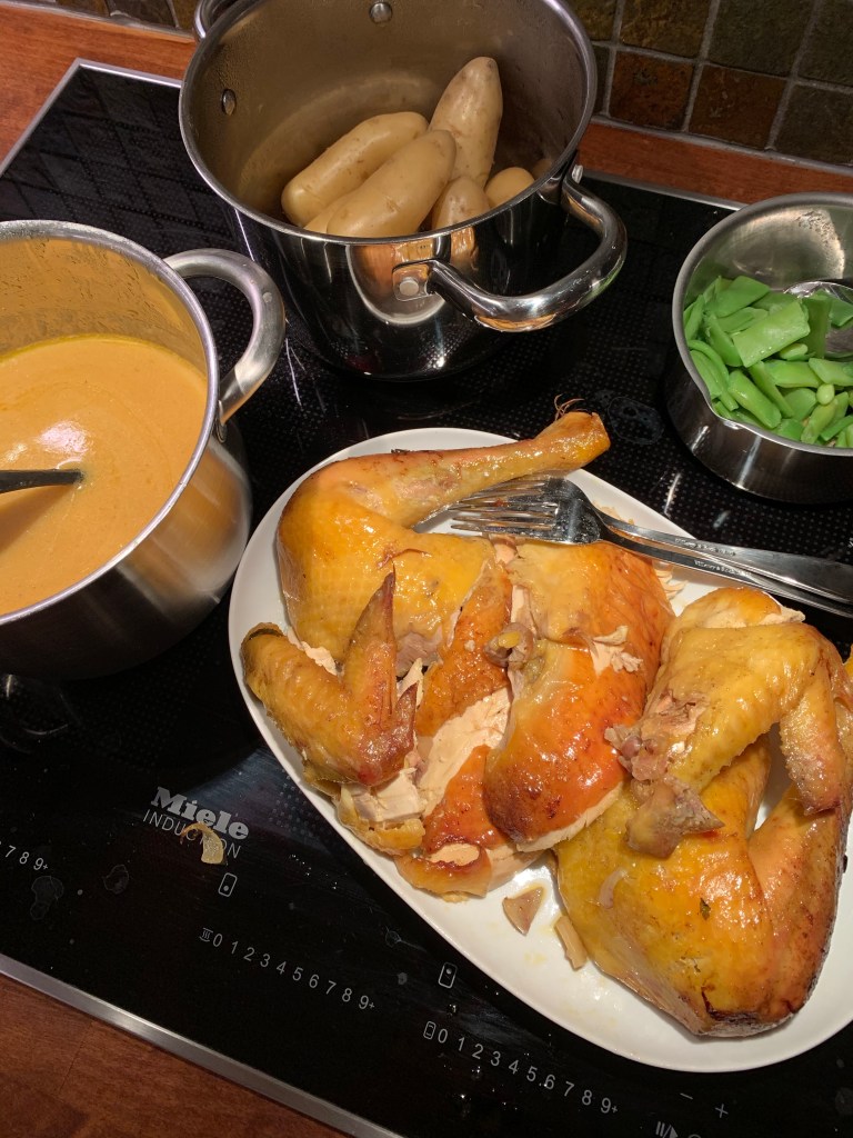 Kalkon är enklare än man tror att laga. Tillagning i ugn tar ca 45 min/Kg på 175 grader. Använd en bra termometer för att hålla koll på innertempraturen. Allt efterkokar lite. Färdig temp är 76-82 grader. Saftig och färdig så är 78 grader en bra temperatur. Här har jag lagat en kalkon på 2,8 kg det tog 2h 45min i nedre delen av ugnen. Efter 2 h ta ut kalkonen och snitta loss benen så att benen blir klara samtidigt som bröstköttet som annars blir klart mycket tidigare och riskerar att bli torrt.