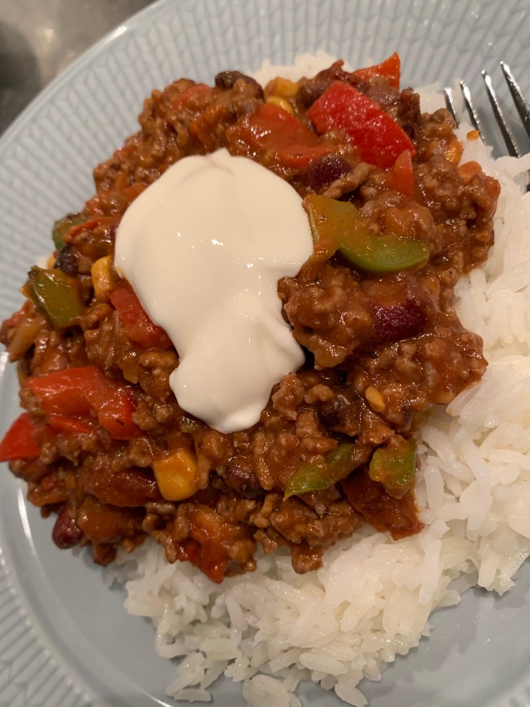 Stek i olja, tärnad paprika och hackad lök därefter stek köttfärsen och blanda ihop. Skölj de blandade bönorna i kallt vatten och rör sedan i dem. Tillför sedan resten av ingredienserna blanda, tillför ca 1,5 dl vatten och låt puttra. På mellan värme tills inget vatten ligger och flyter. Serveras med ris och en klick gräddfil om man vill.