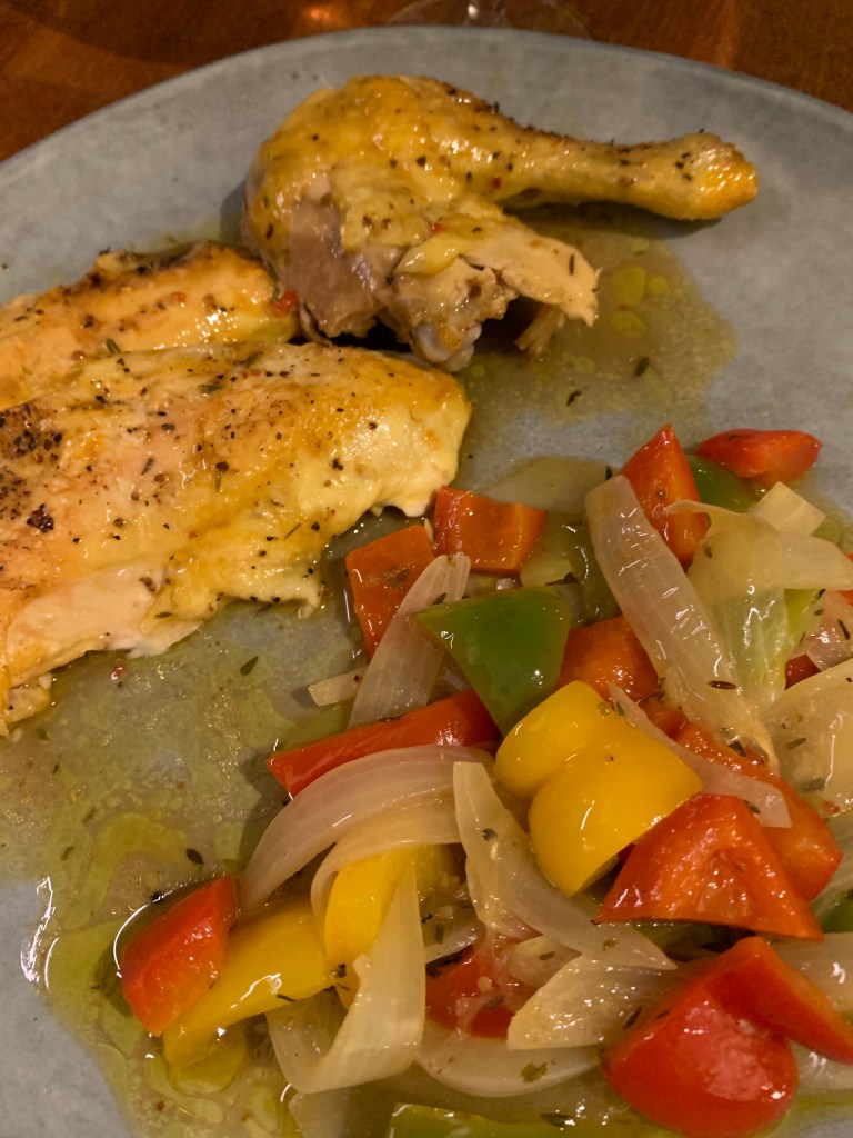 Grönsakerna är tillagade på spisen, stekta i olivolja och riktigt smör. När grönsakerna mjuknat lite utan att vara helt stekta pressa saft från 1-2 citronskivor över grönsakerna klicka i mer smör och häll på 1 dl vitt vin och 1 dl vatten och smula ner 2 tärningar med hönsbuljong. När tuppen är klar häll över stekskyn från ugnen i grönsaksblandningen och rör om. Värm upp och servera.