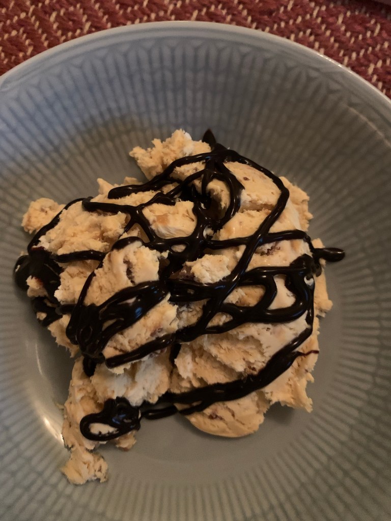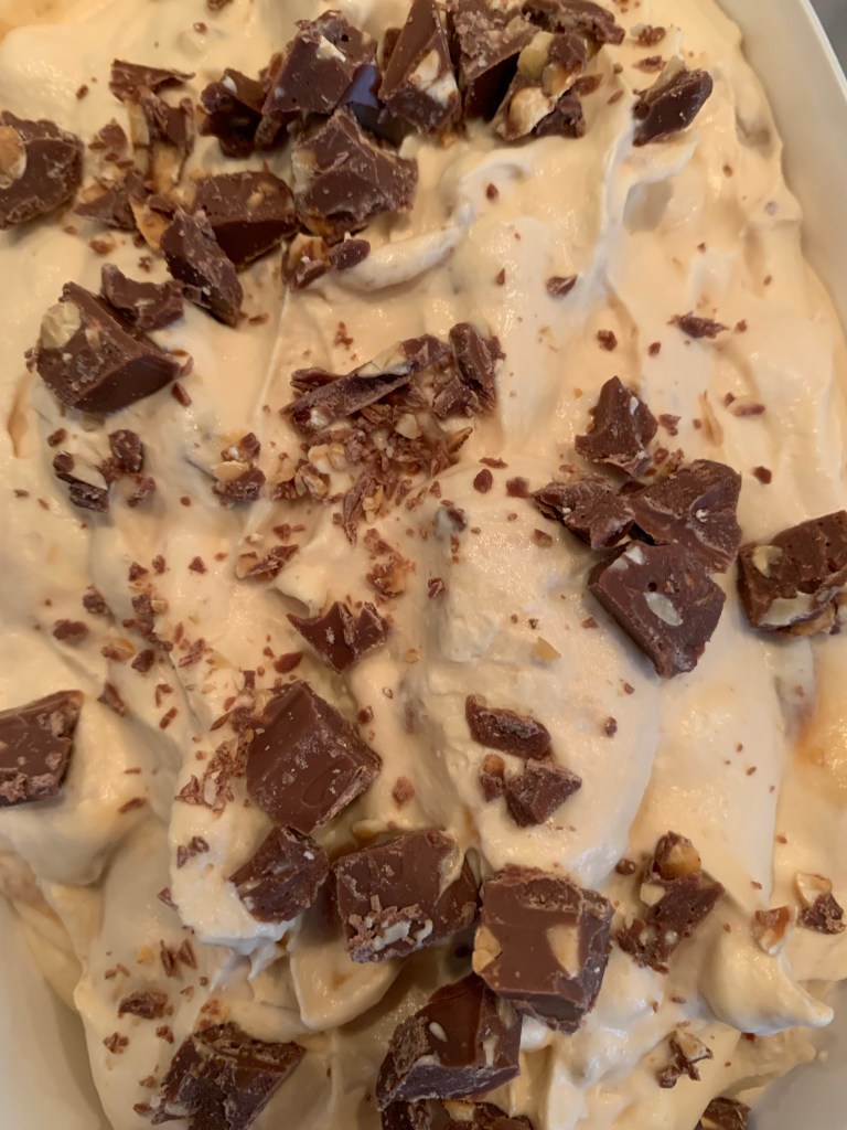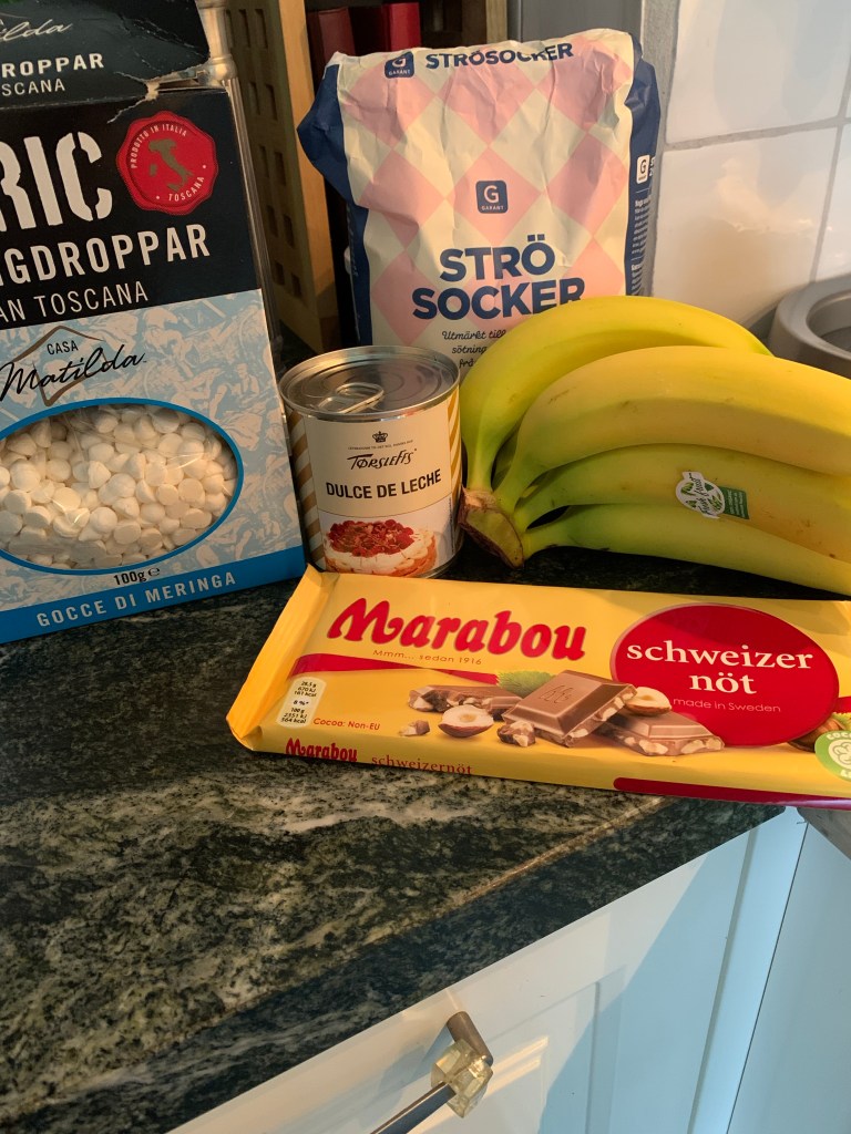 Nu är glassen färdig som grund. Blanda i lite minimaränger ca en näve. Mammas näve 😉 (de är väldigt söta så ta inte för mycket) hacka ner chokladen och skiva ner 1 banan och rör runt. Häll över i byttan som ska förvaras i frysen. Strö sedan över lite extra choklad på toppen för att den ska se fin ut. Därefter behöver glassen ca 6-7 timmar i frysen.