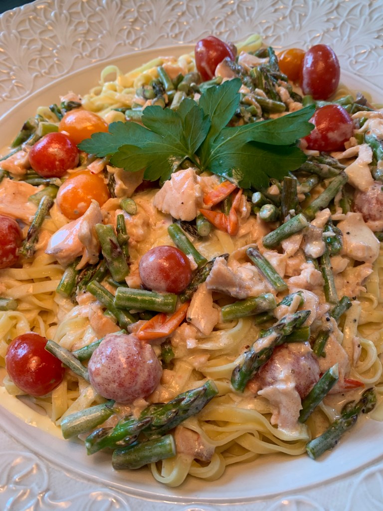 Här har jag använt färska nysparris dvs små smala sparris och körsbärstomater samt 4 skivor rökt lax och ett paket färsk tagliatelle.