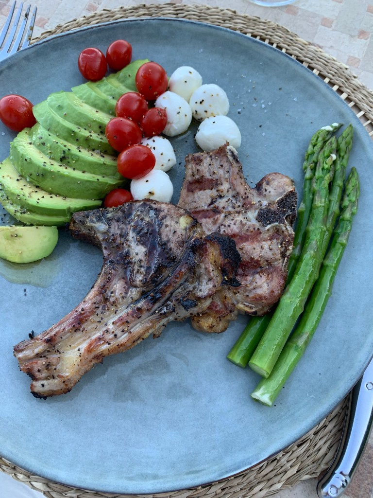 Tillbehör i det här fallet är avokado, hemmaodlade pärltomater och minimozarella och oliv olja samt några sparris vid sidan.