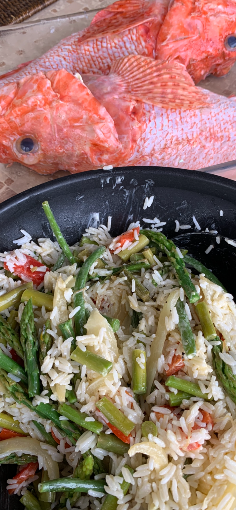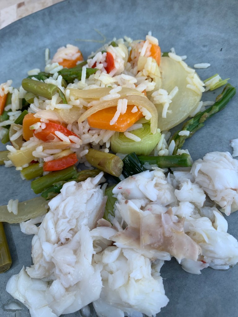 Tillredning: Hela fisken i ugnen. Ha på och i, citronsaft, vitpeppar, salt, smör och när den är klar och rensad ha på lite skirat smör och flingsalt samt lite olivolja.