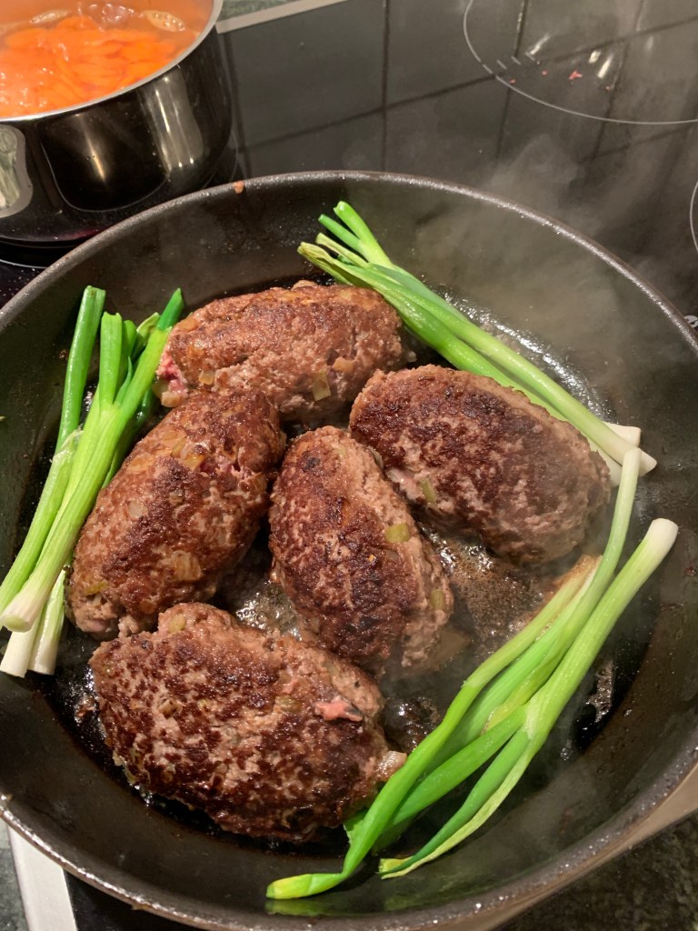 Stek en hackad lök och blanda den stekta löken med färsen, tillsätt ett rått ägg, 2/3 dl ovispad grädde, vitpeppar, salt och motsvarande 1 buljongtärning mald köttbuljong. Forma biffarna och stek på hög värme tills de fått jämn färg. Sänk sedan värmen till medelvärme och lägg ett lock på. Vänd biffarna med jämna mellanrum. Stektid ca 7 min. På slutspurten lägg i lite salladslök under lock i 2 min. Tid för tillagning varierar med vilken spis man har. Jag tillagar på induktionshäll.
