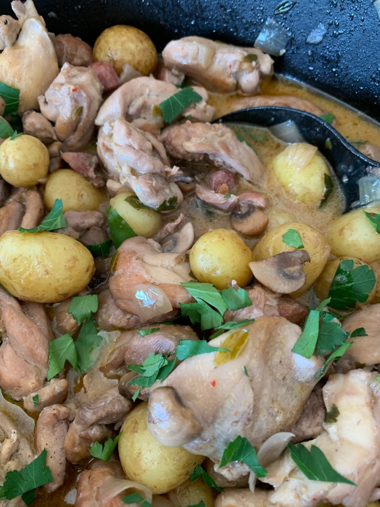 Stek syltlöken och lägg därefter över den i en gryta. Champinjonerna skivar man up i större delar tex 1 normalstor champinjon delas i 3, stek och lägg därefter över i grytan. Skär upp ölkorven/ valfri smakrik korv och lägg i grytan. Stek därefter kycklinglårfiléerna, så att de får färg men bara till gränsen klara, i smör och olivolja. Salta och peppra och strö över lite ströbröd över kycklingen när den ligger i pannan. Det ska inte bli en panering utan endast lite hjälp till redning. Lägg över kycklingen i grytan och slå vatten över ingredienserna så att det knappt täcker. Ha i kycklingbuljong och timjan samt vin. Låt puttra 15-20min. Om man vill att den ska vara mildare kan man ha i 1 dl valfri grädde.