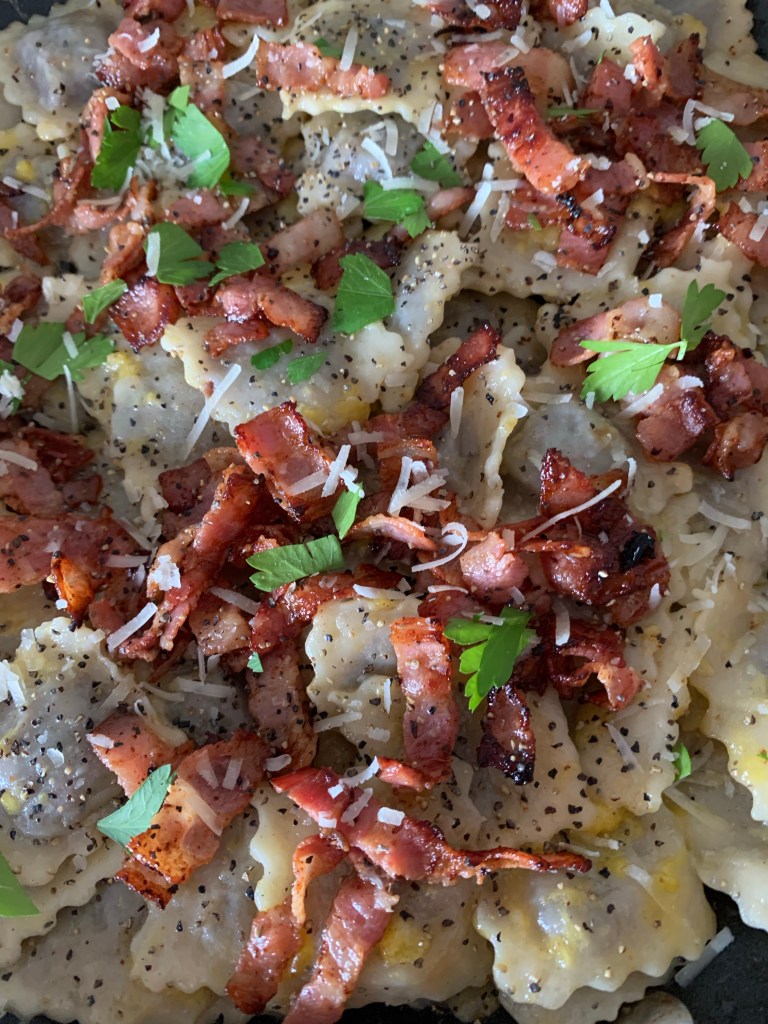 Koka raviolin. Häll av pastan och lägg över den färdiga pastan i fettet i baconpannan.Rör ner en rå äggula i pastan och ha på baconet och lite klippt bladpersilja. Strö färsk parmesan över rätten.