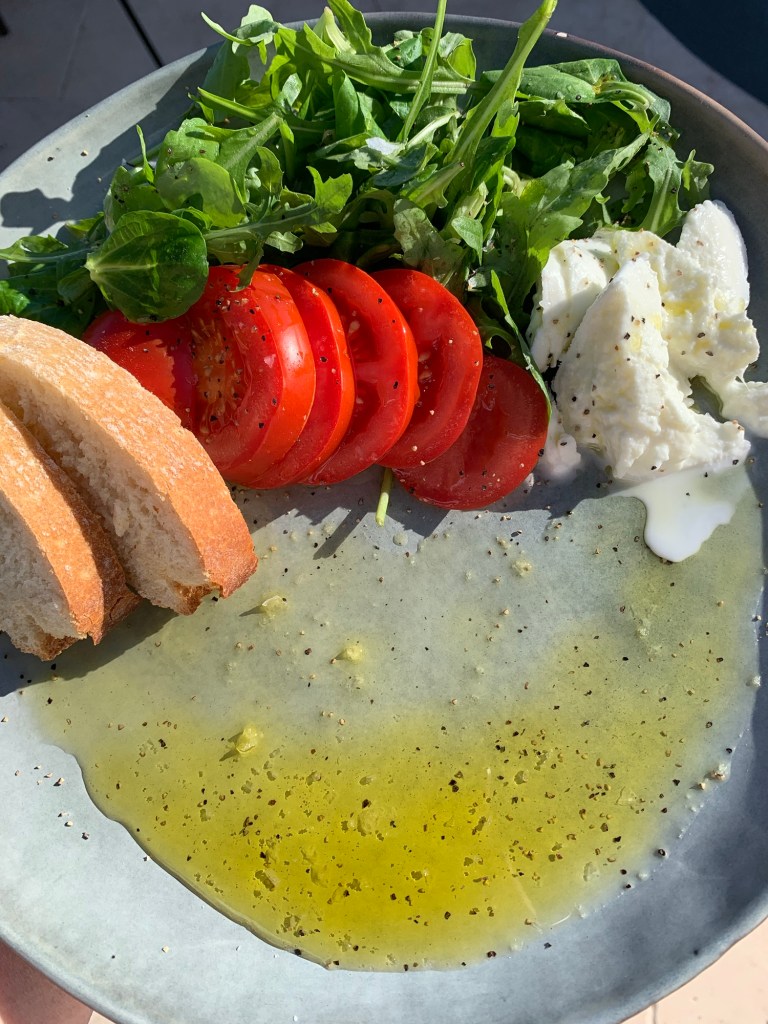 Gör i ordning ruccolasalladen och skiva tomater och buffalomozzarella häll lite god olivolja över och extra vid sidan om. Salta med lite flingsalt och peppra med svartpeppar.