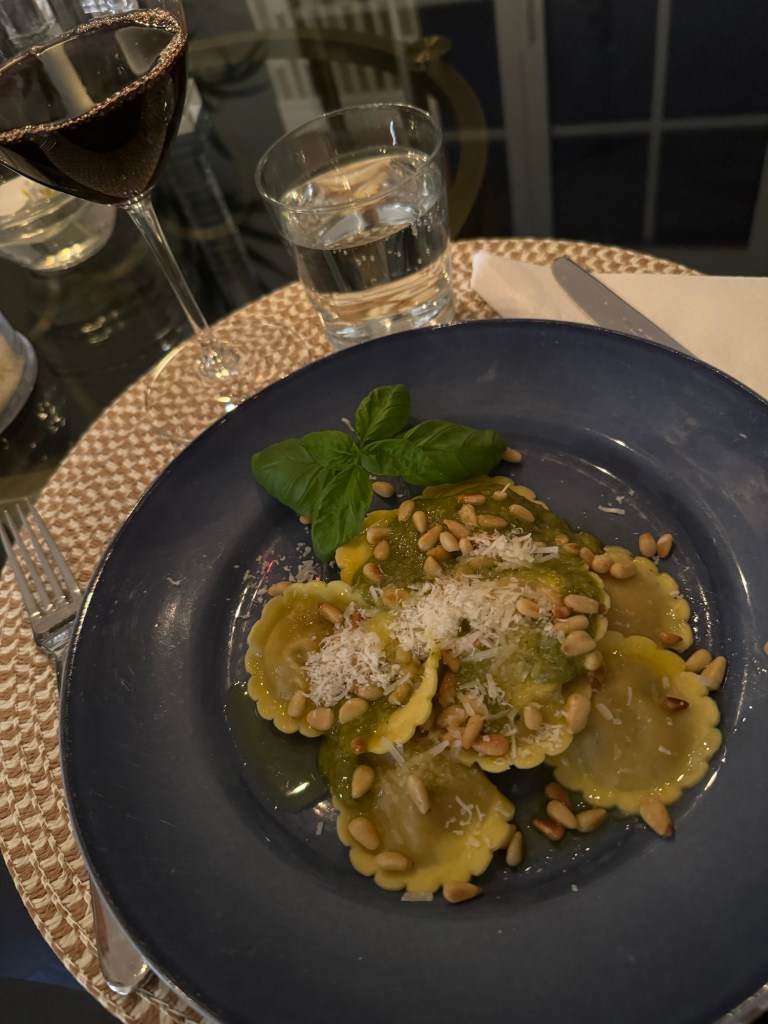 Svampravioli med pesto och rostade pinjenötter, parmesanost och färsk basilika är mumma. Köper man färdig pesto så rekommenderar jag att addera mer olivolja..