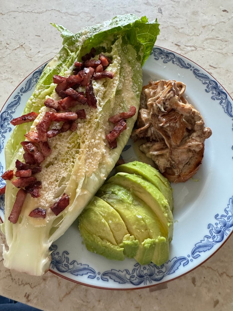 Romansallad med krispiga baconbitar, rostade pinjenötter och naturell dressing samt riven parmesan. Till detta en halv skivad avokado med lite olivolja och flingsalt.