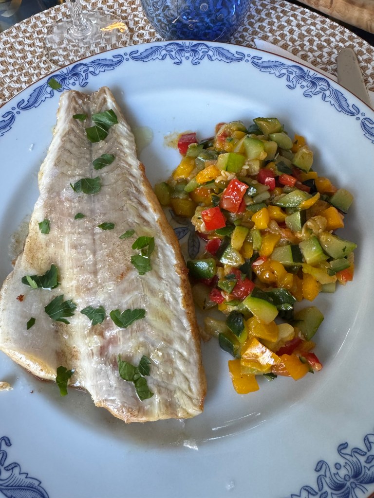Här serveras den smörstekta fisken med lite olivolja, bladpersilja och salt och med en sido servering av sörstekta och lättsaltade hackade grönsaker.